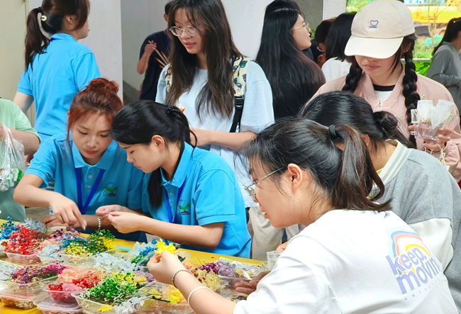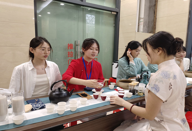 茶日活动以茶为特色,亮点纷呈,吸引了众多学生的积极参与。现场巧妙布局,将“U”形空间划分出六大茶区,参与者依凭个人喜好,自由选择茶类进行品鉴。为了增强互动性,活动特别设计了集印章通关环节,参与者每成功通过一个游戏,即可获得一枚印章,集齐六个印章后,可通过抽奖领取不同奖品,并对奖品进行个性化创新。活动种类繁多,从猜茶谜、写茶联,到观图识叶、茶叶拓印、古韵乐投,乃至别出心裁的花果茶DIY、口罩茶包等活动,无一不展现出活动的精彩纷呈。整个活动过程中,师生们穿梭于场地间,欢声笑语此起彼伏。