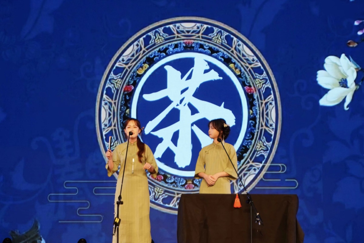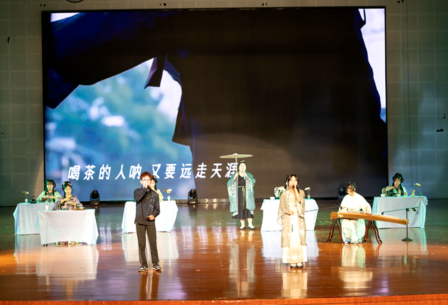 弹唱《春风十里》悠扬响起,相声《说茶》妙语连珠,群舞《茶雨》身姿柔美,晚会的氛围渐入佳境。在《那盏茶》深情款款的歌声中,时间仿佛凝固,让人徜徉于烟雨朦胧的江南水乡。而舞蹈《新雨寻茶》,以灵动的舞步展现了对未知世界的好奇探索及对未来生活的美好向往。2023级电子科学与技术1班全体同学带来的剧场秀《青春有你》以一种别开生面的形式登台,生动再现了同窗之间的深厚情谊与共同成长的温馨画面,将晚会推向了高潮。
