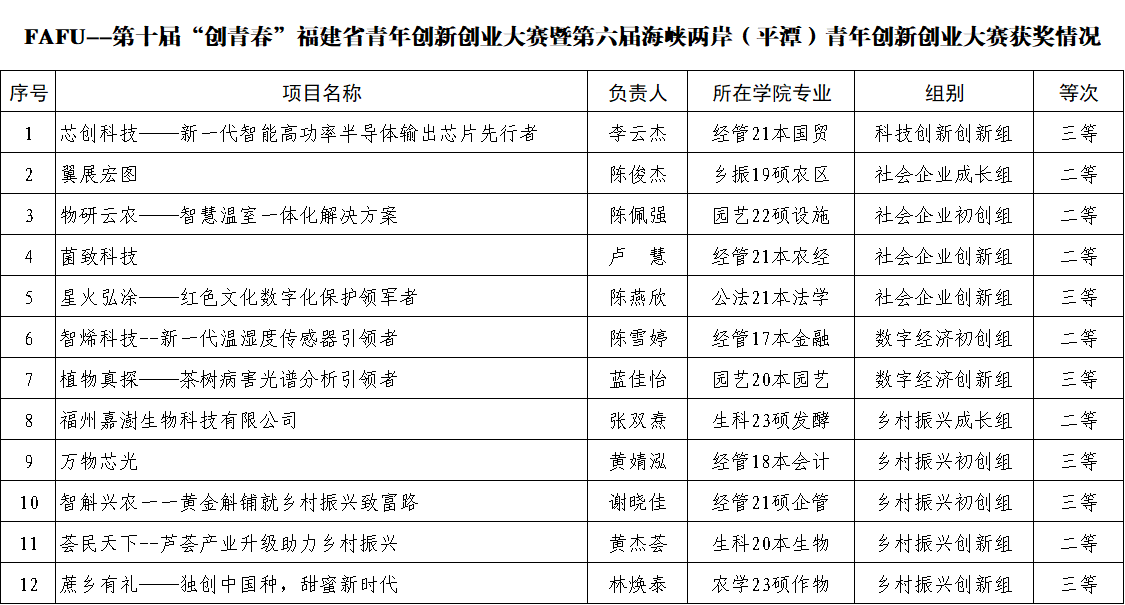 5月22日,第十届“创青春”福建省青年创新创业大赛总结交流活动在平潭举行。我校获大赛优秀组织奖,12件作品获奖(全省105件作品获奖),其中《福州嘉澍生物科技有限公司》等6件作品获二等奖,《蔗乡有礼——独创中国种,甜蜜新时代》等6件作品获三等奖,获奖数量并列全省第一。