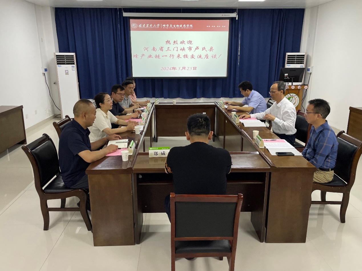 5月25日上午,河南省卢氏县人大常委会副主任、蜂产业链链长王燕一行到蜂学与生物医药学院交流座谈,院长苏松坤等会见客人一行,并在蜂学楼206室进行座谈。