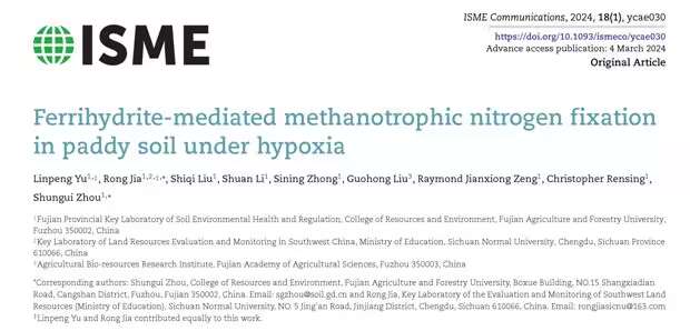 近日,开云网页版资源与环境学院周顺桂教授团队在《国际微生物生态学通讯》(ISME Communications)发表了题为“Ferrihydrite-mediated methanotrophic nitrogen fixation in paddy soil under hypoxia”(缺氧环境下水稻土中水铁矿介导的甲烷氧化固氮过程)的研究论文。该研究首次证明了好氧甲烷氧化微生物在缺氧环境中可以依赖铁还原驱动生物固氮过程。