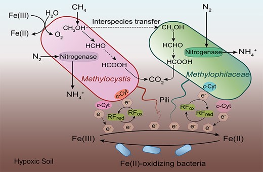 生物固氮(Biological nitrogen fixation)作为水稻生产中活性氮输入的主要来源,是维持稻田土壤肥力水平的基础。甲烷是固氮微生物重要的碳源与能源,在稻田生物固氮过程中具有重要贡献。传统观点认为甲烷氧化驱动高耗能的固氮反应需要依赖氧气才能进行。然而稻田长期的淹水环境使得其中丰富的铁氧化物成为甲烷氧化菌的优势电子受体,但铁依赖的甲烷氧化过程是否可以驱动生物固氮尚未达到,因此阐明其作用机制及对稻田活性氮输入的贡献具有重要意义。