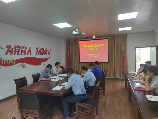 为推动党纪学习教育和学院工作互促共进,从严从实抓好巡察整改,以党纪学习教育的新成效引领保障学院工作高质量发展,5月28日,公共管理与法学院在学院416会议室召开校院规章制度专题学习会。院党委书记曾起郁主持会议,学院领导班子成员、全体行政人员参加会议。