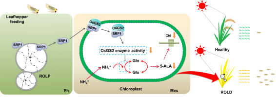ROLP由电光叶蝉(Recilia dorsalis)作为主要传播介体,在田间以持久增殖型方式传播的。ROLP可以突破介体组织屏障,在介体内完成侵染循回后,随昆虫取食传播到水稻中,在广东、广西和福建等南方稻区流行。该研究以ROLP效应蛋白SRP1-电光叶蝉-水稻为研究对象。通过生物学实验观察统计发现ROLP侵染导致水稻黄化能够吸引电光叶蝉取食。为进一步明确水稻黄化的机制,通过酵母双杂交筛选、pull-down和Co-IP等实验发现效应蛋白SRP1与OsGS2存在互作,通过OsGS2协助从维管束转运到周围叶肉细胞,并定位于叶绿体。进一步研究发现SRP1结合OsGS2蛋白,破坏水稻OsGS2全酶十聚体结构,从而抑制其酶活性,导致OsGS2代谢途径下游氨基酸产物GLN、GLU以及叶绿素合成的必要前体物质5-ALA的合成受阻,进而阻碍水稻叶绿素的合成,导致水稻叶片黄化。