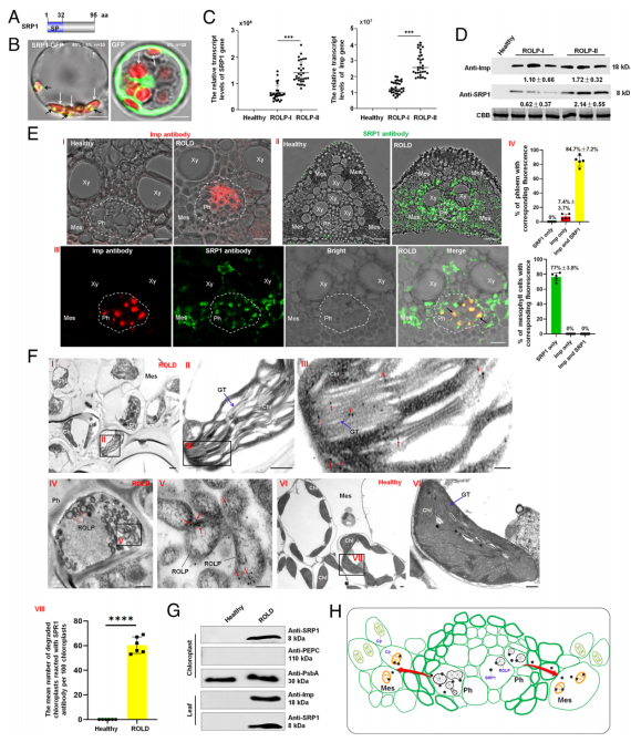 为进一步阐明SRP1在ROLP侵染导致水稻叶片黄化中的作用,构建了SRP1过表达转基因水稻。实验发现SRP1过表达转基因水稻表现出与水稻橙叶病相似的黄化症状,并且叶绿体结构破坏,OsGS2酶活下降及其介导的代谢途径产物合成降低。实验证明SRP1过表达转基因水稻更能吸引电光叶蝉的取食。因此SRP1导致水稻叶片黄化,从而更加吸引电光叶蝉取食并促进其传播。