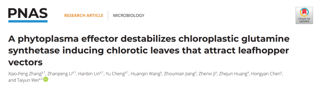 2024年5月22日,我校植物保护学院魏太云研究员团队在《PNAS》(《美国国家科学院院刊》)在线发表了题为"A phytoplasma effector destabilizes chloroplastic glzutamine synthetase inducing chlorotic leaves that attract leafhopper vectors"(植原体效应蛋白诱导水稻叶片黄化促进昆虫传播)的研究论文,揭示了水稻橙叶病植原体(Rice orange leaf phytoplasma, ROLP)效应蛋白SRP1通过抑制叶绿体谷氨酰胺合成酶(OsGS2)酶活性,使叶绿体合成受阻,进而使水稻叶片发生黄化现象。叶片黄化能够更加吸引电光叶蝉取食,从而促进ROLP水平传播,为解析ROLP致病机制以及吸引媒介昆虫取食的复杂机制奠定了研究基础。