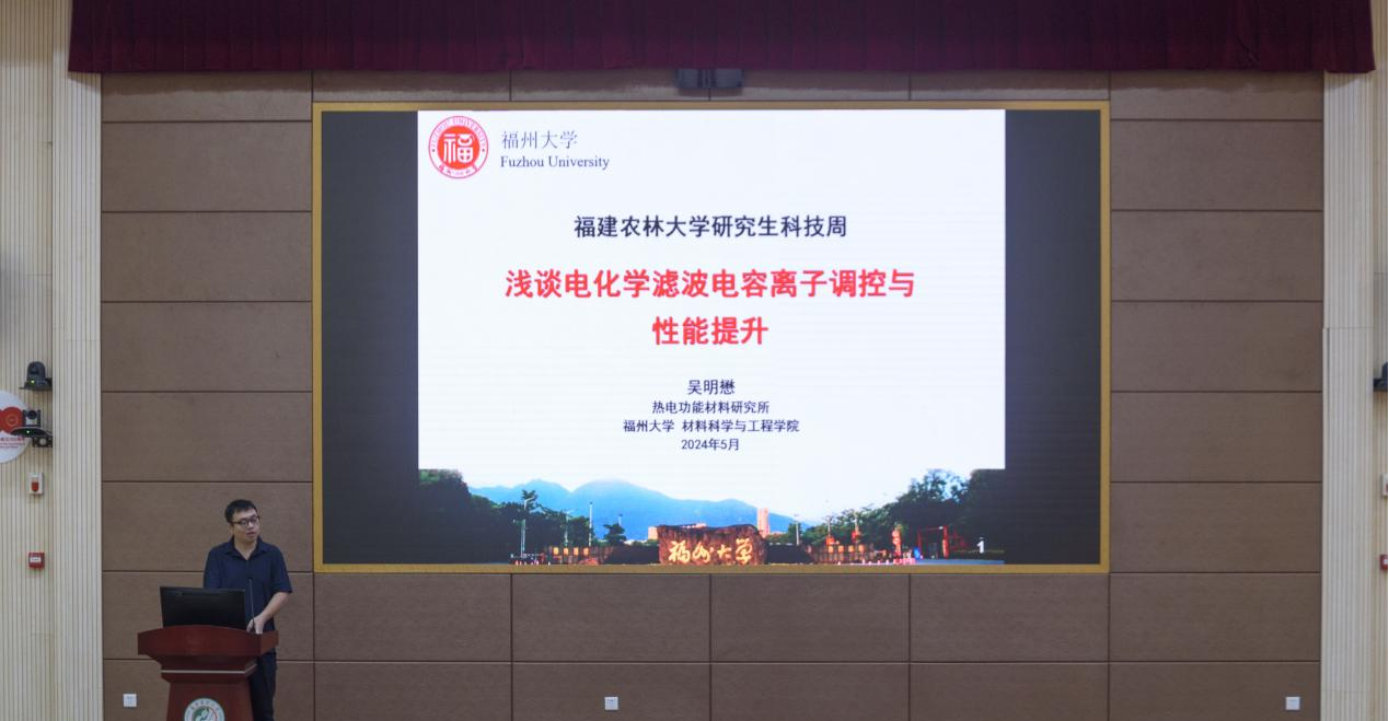 吴明懋副教授介绍了电容器的研究背景及传统电容器的劣势,指出了电化学电容器在交流滤波中面临的挑战,并分享了构建三维多孔电极、完全垂直结构电极、MXene 复合垂直电极、纤维状电化学滤波电容的工作内容以及局域电场增强策略等。
