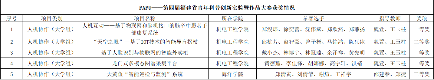 5月25日,第四届福建省青年科普创新实验暨作品大赛暨第十届全国青年科普创新实验暨作品大赛福建赛区比赛在福建省科技馆正式开赛。我校获大赛优秀组织奖,5件参赛作品获奖,其中《人机互动—基于物联网和脑机接口的脑卒中患者手部康复系统》获一等奖、《“天空之眼”—基于IOT技术的智能导盲拐杖》等3件作品获二等奖、《大黄鱼“智能巡检与监测”系统》获三等奖,获奖总数为全省高校第一。