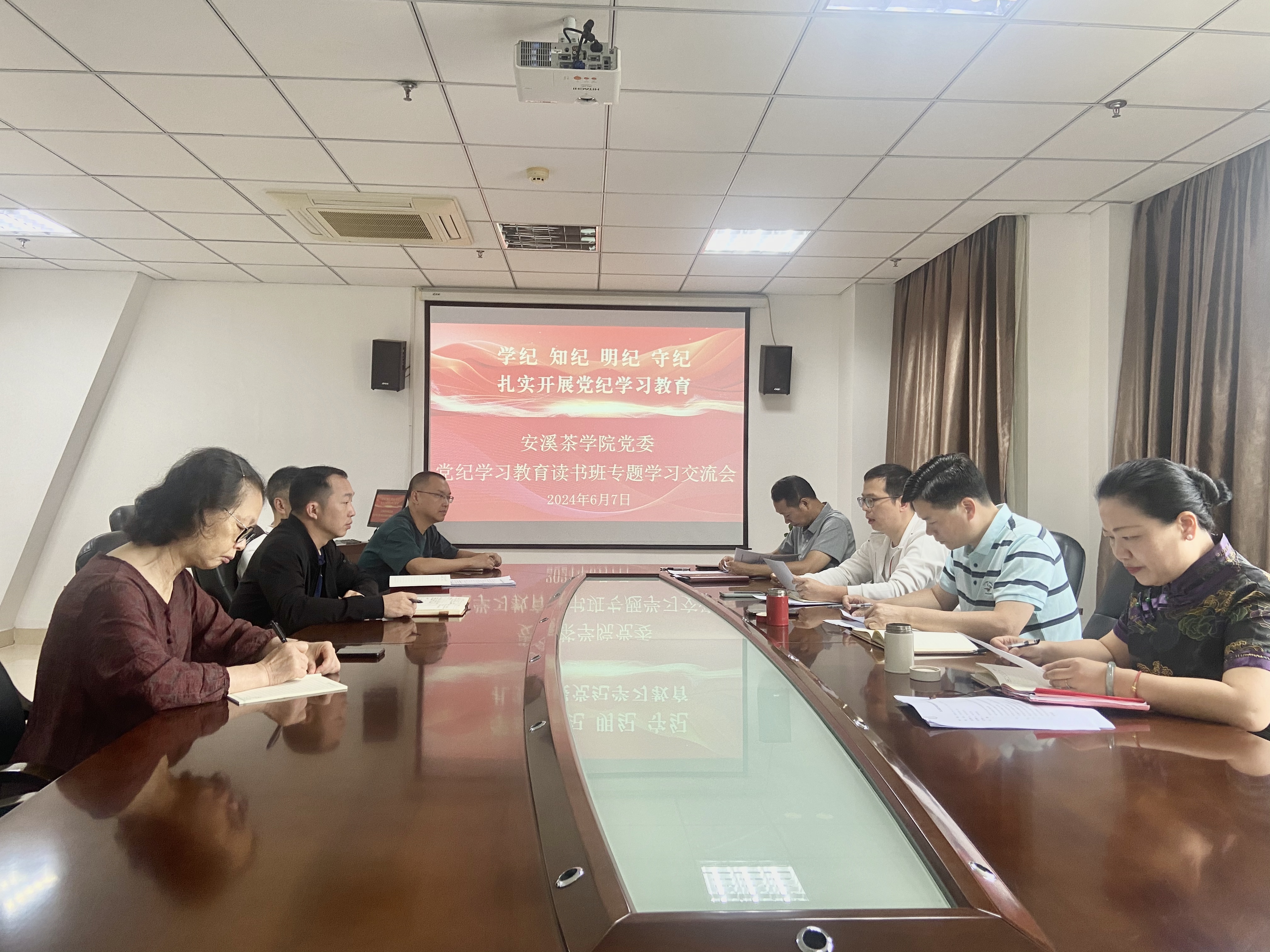 6月7日上午,安溪茶学院党委召开党纪学习教育读书班第三场专题学习交流会。学院领导班子成员、科级干部参加会议。会议由学院党委副书记(主持工作)黄成茂主持。