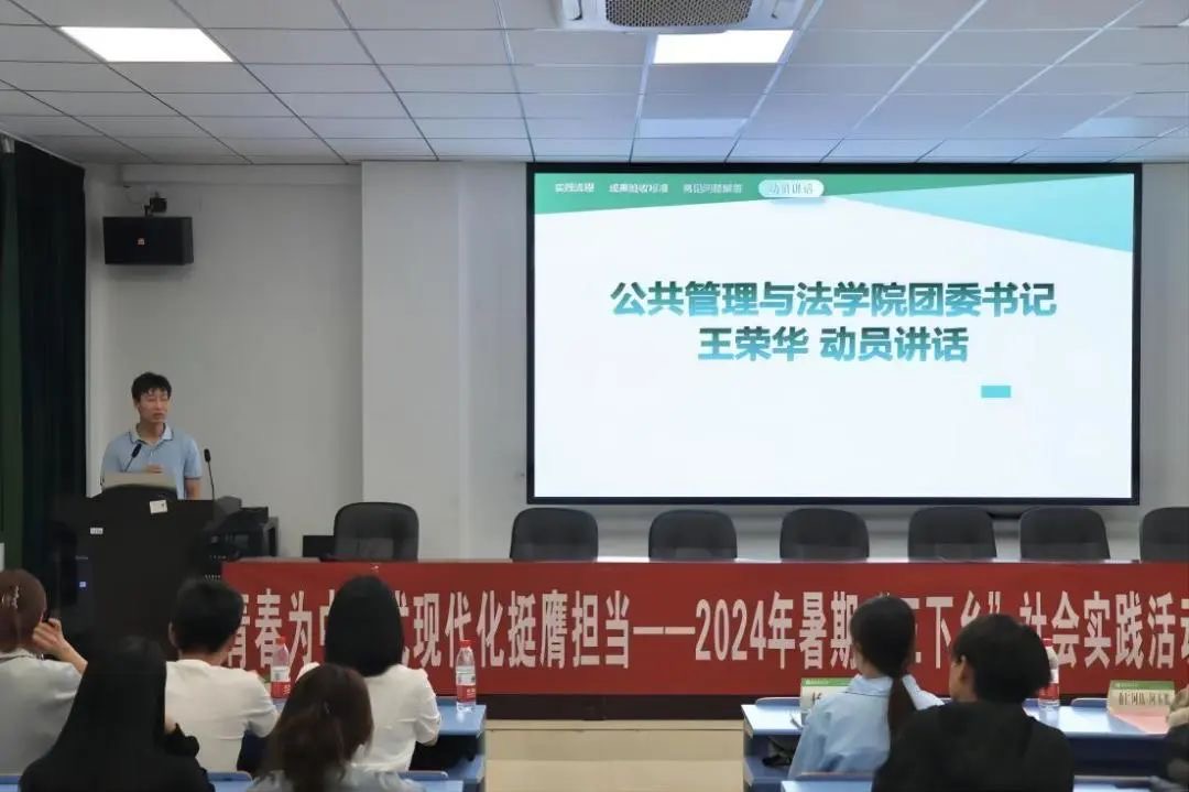 6月6日,公共管理与法学院于诚智楼A302室召开青春为中国式现代化挺膺担当——2024年暑期“三下乡”社会实践活动动员大会,学院团委书记王荣华、辅导员希仁阿依、杨小倩、沈芳儒出席会议,优秀实践队伍代表林瑜臻、郭弘毅、陈桑、李硕烁以及80名学生参加会议。