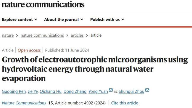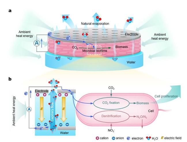 能量的供给与利用是地球上一切生命形式的基本科学问题。目前公认的微生物能量来源有光能和化学能两种:即太阳能(太阳光子)和化学能(元素价电子)。太阳光子和元素价电子也是微生物生长的两种能量来源,被分别称为光能微生物和化能微生物。2004年,美国微生物科学院院士Lovley RD教授报道了一则里程碑式的发现:某些微生物可直接利用电能生长增殖,暗示自然界可能存在一类全新能量代谢类型的微生物——电能微生物。与光能或化能微生物的电子摄取方式不同,电能微生物所利用的电子来自细胞胞外。水蒸发是全球水循环中普遍存在的自然物理过程,每年水蒸发量约为520亿立方米,是全球人类可利用水资源量的57倍。传统观点认为:水能到电能的转化只能通过“水势能→机械能→电能”的过程。最新研究发现,水蒸发过程中水分子与材料亲水基团的相互作用,可以实现直接将环境热能转化为可持续的水伏能。该团队前期证实,活体微生物生物膜中水蒸发也可以产生水伏电能。然而,水蒸发诱导的水伏胞外电子能否被微生物作为一种新能源来维持生长和代谢,仍有待探索。