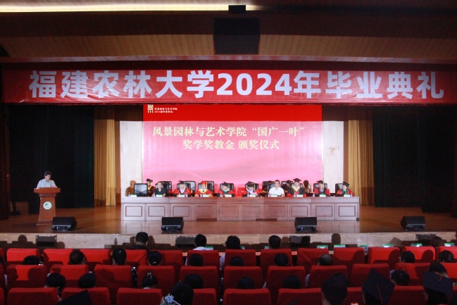 6月13日下午,风景园林与艺术学院于旗山校区大报告厅举办2024年度“国广一叶奖学奖教金”颁奖仪式。闽侯县慈善总会秘书长王祖强、福州校友会会长陈荣顺、执行会长杨华庆、监事长佘智彬、学院党政领导班子出席颁奖仪式,2024届全体毕业生及部分家长、在校生共1300余人参加颁奖仪式。