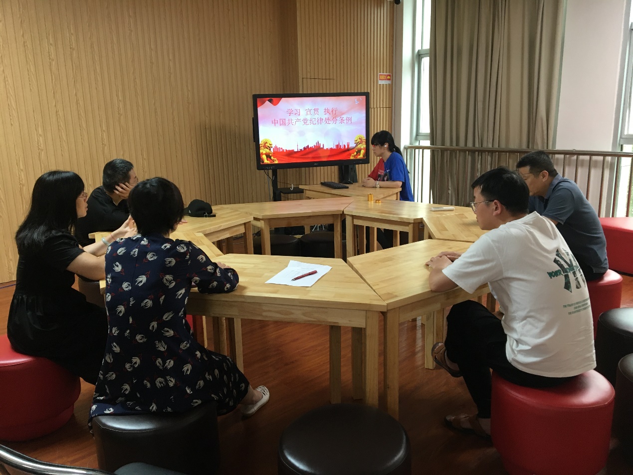6月13日下午,图书馆资源建设与保障部教工党支部在逸夫图书馆研讨间开展了党纪学习教育专题党课,深入学习领会新修订的《中国共产党纪律处分条例》(以下简称《条例》)。