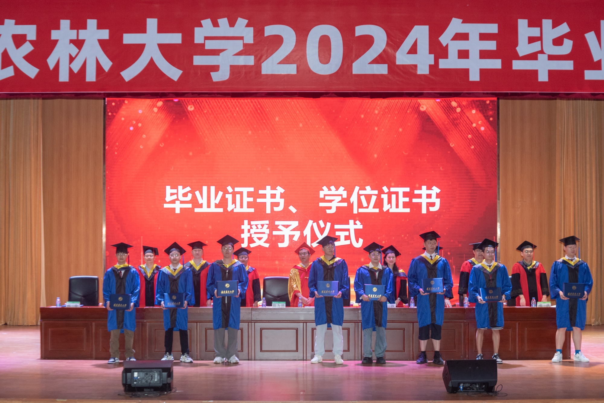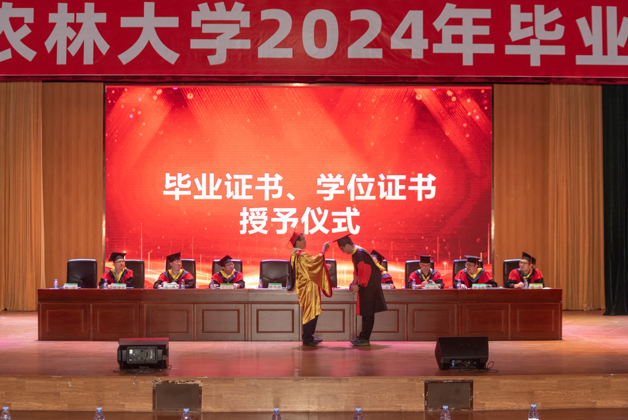 在毕业证书、学位授予环节,学院各位导师代表身着导师服,为2024届毕业生颁发证书、执拨穗礼。“拨苏正冠,拨穗正对”,拨穗仪式象征着毕业生们正式告别校园生活,迈向新的人生阶段。致谢、拨穗、留影,现场庄重而温馨。