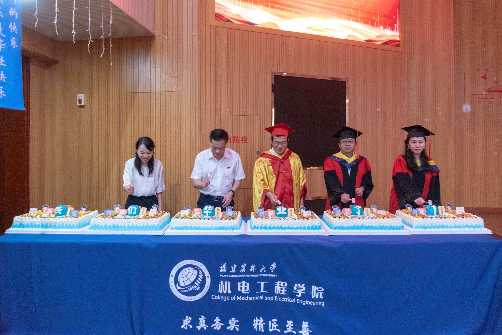 典礼现场还为毕业生们准备了毕业蛋糕和毕业纪念品,学院领导班子共同敲彩蛋、切蛋糕,祝福同学们鹏程万里、一生幸福!