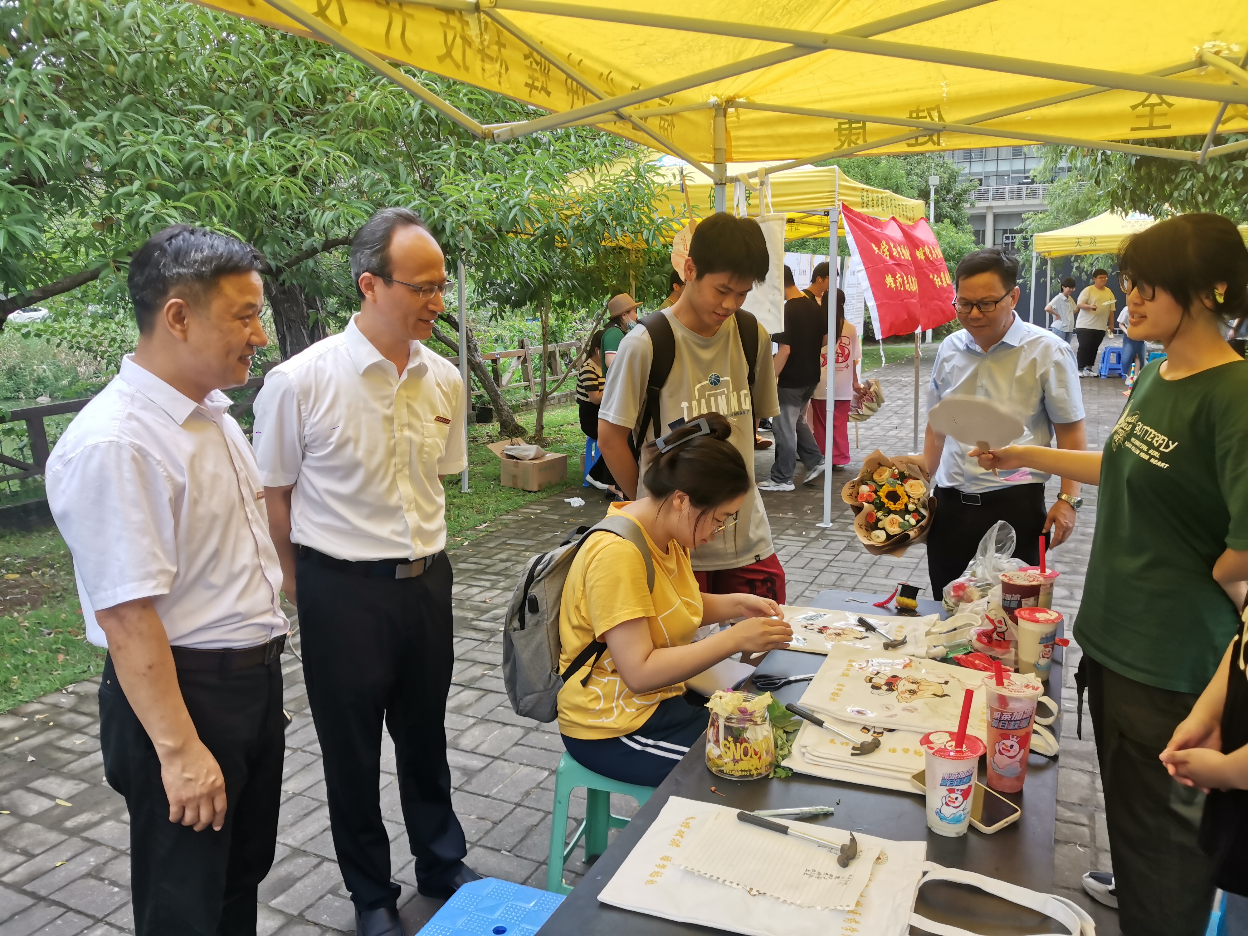 在求知路两侧,学院展出蜂学知识科普展板、学术科技作品展板等,介绍了蜂蜜、蜂毒、蜂胶等蜂产品的作用和价值,展示实验室风采和研究生学术作品,向全校师生展现了学院科技创新成果和育人成效,推动蜂学与生物医药专业学科被更多人知悉。毕业游园还开设五个主题活动区,分别为圆舞曲集、锤草印花、绘梦色谱、蜂疗义诊、墨韵彩绘扇,进行套圈、diy帆布袋、看字识图、漆扇、蜂疗义诊和毕业生同绘画卷等活动,吸引了大量毕业生与在校师生参与其中。活动中所设计产出的帆布袋、笔、文件袋、钥匙扣等精美礼品被一一赠与毕业生。毕业生纷纷表示要坚定专业信念,发扬蜜蜂勤勉品格,勤劳耕耘,勇往直前,乘“蜂”破浪,逐梦远航,努力在各自的领域里发光发热,创造属于自己的辉煌。
