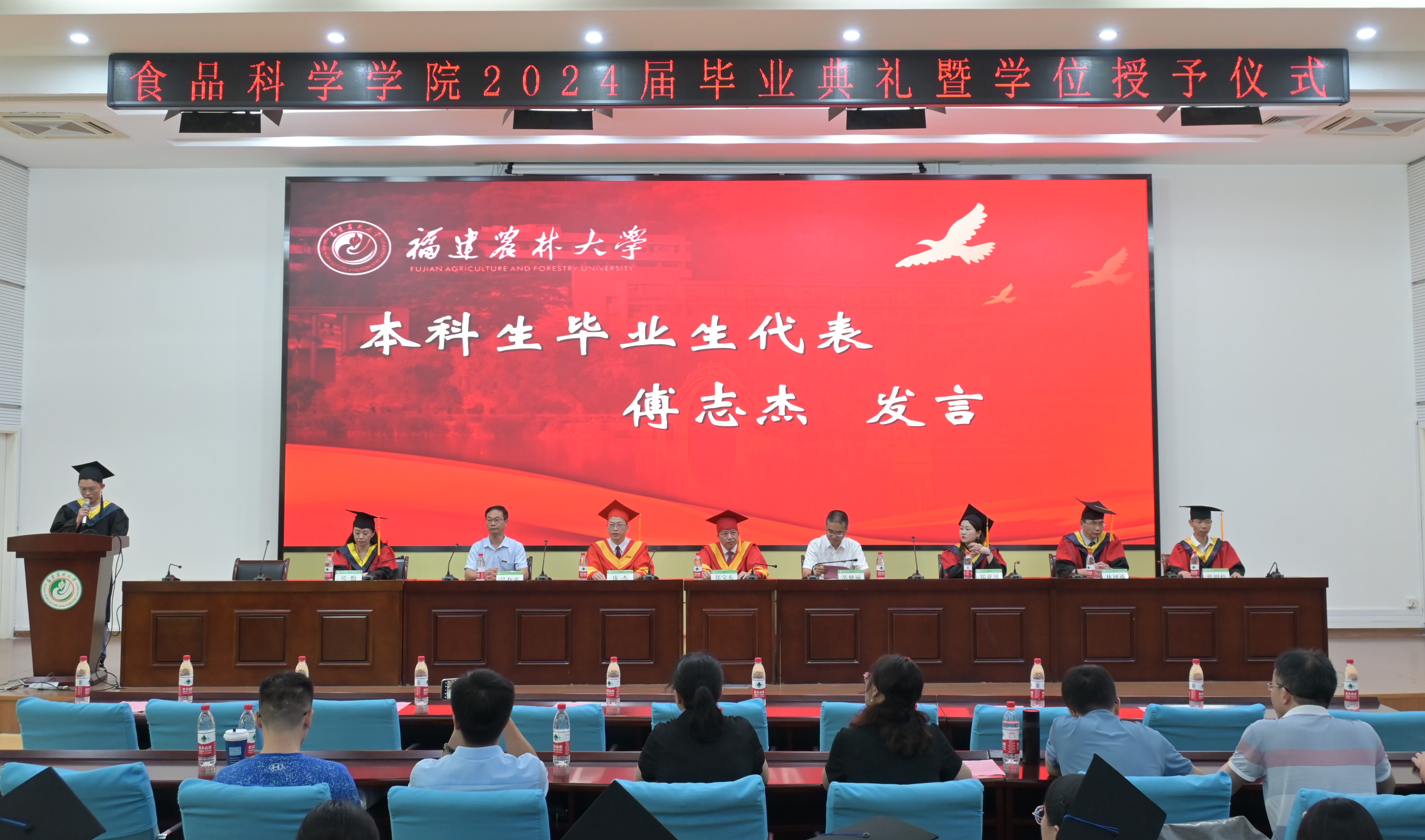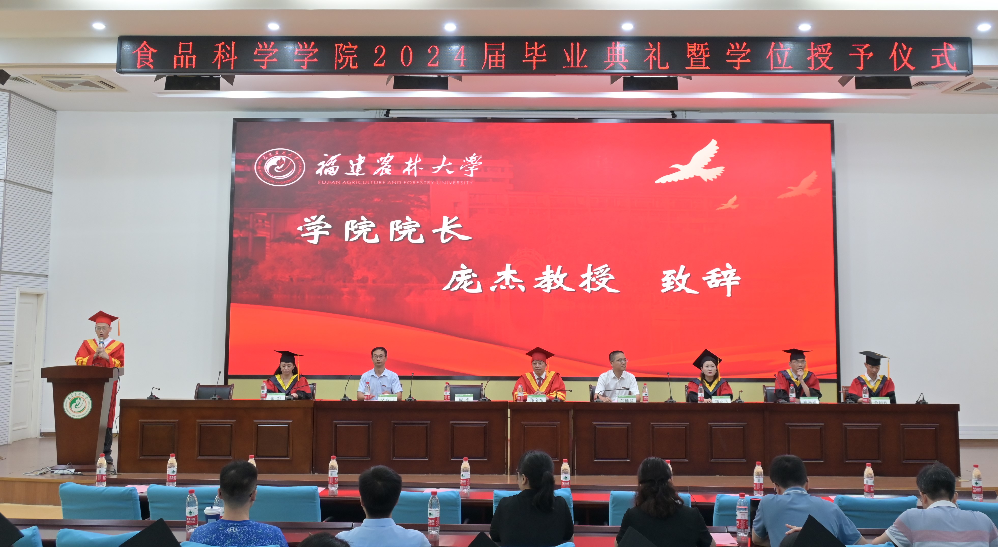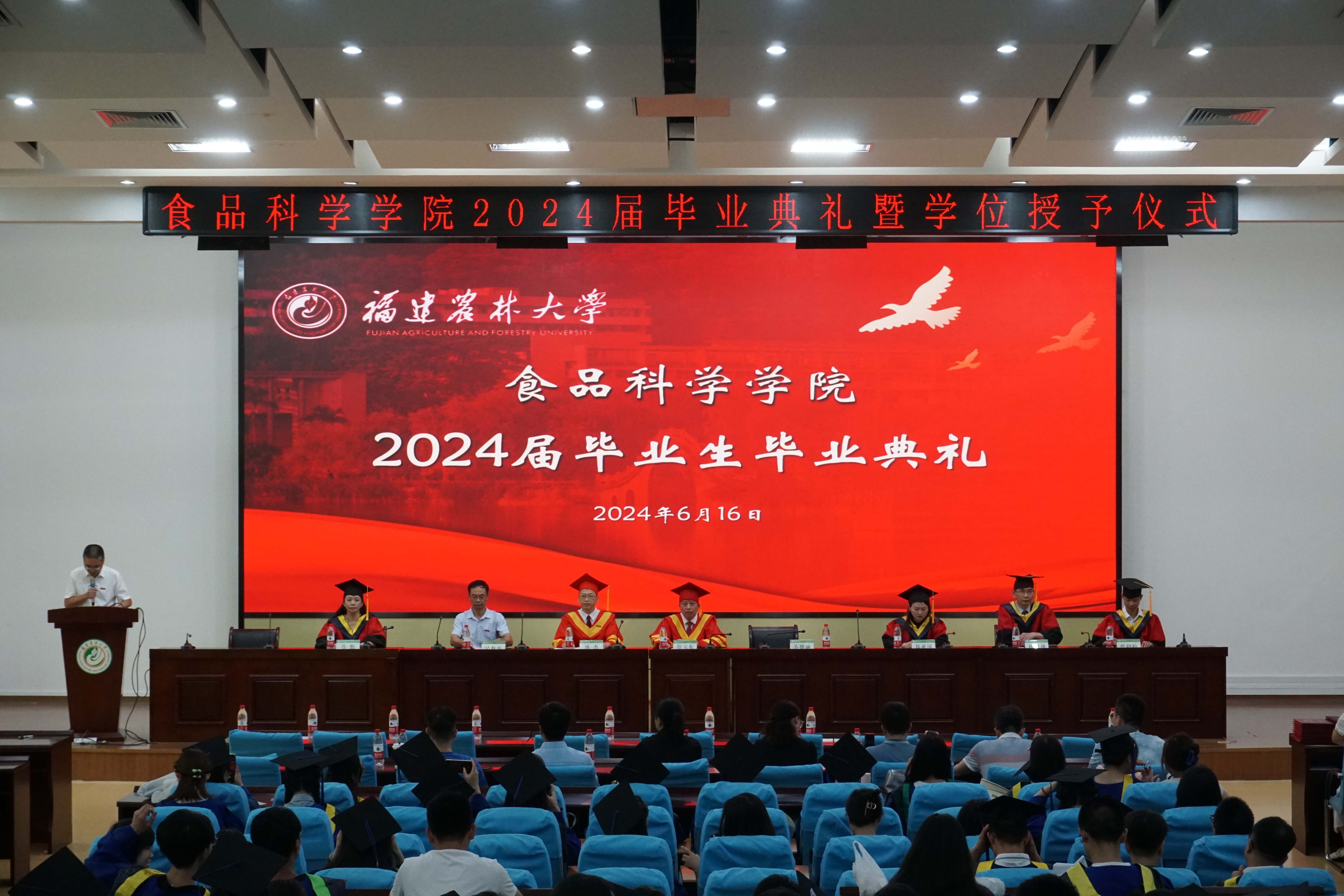 6月16日下午,食品科学学院2024届毕业生毕业典礼暨学位授予仪式在禧强楼学术报告厅举行。副校长郑宝东,学院党政班子成员,教师代表,辅导员及全体毕业生出席仪式。毕业典礼由学院党委书记苏健涵主持。