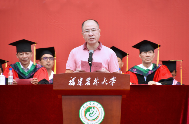 毕业生家长代表、泉州市委网信办四级调研员,全国“学习新党章”先进个人,全省“优秀党务工作者”、“福建省五一劳动奖章”获得者林培山先生发言,感谢学校、教师对孩子的谆谆教导和悉心栽培,希望毕业生们心系农大、铭记农大,立足岗位,努力工作,奋力书写为中国式现代化挺膺担当的人生篇章。