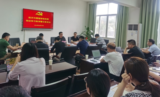 6月19日上午,经管学院召开党纪学习教育警示教育会,深入学习贯彻习近平总书记关于全面加强党的纪律建设的重要论述精神,传达学校党纪学习教育警示教育会精神,深化以案促学、以案促改、以案促治,让全院党员干部在学纪、知纪、明纪、守纪上下功夫,推动党纪学习教育走深走实。会议由院党委书记张开晃主持。学院领导班子、教工支部书记、系主任、科级干部、辅导员参加会议。