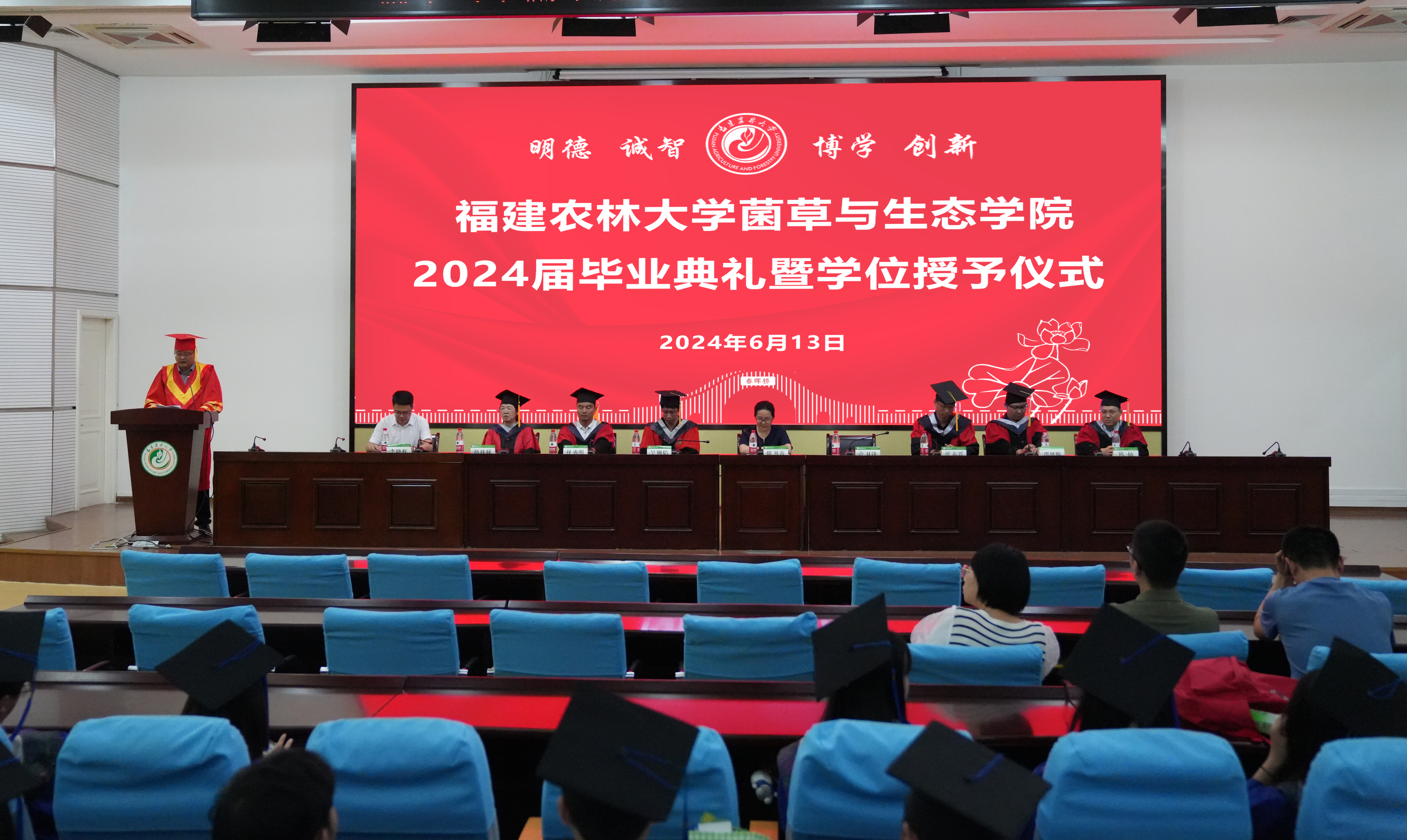 6月13日下午,菌草与生态学院首届毕业典礼暨学位授予仪式在禧强楼学术报告厅举行。学院领导班子成员、系主任、导师代表、班主任代表、辅导员、家长代表、全体毕业生参加毕业典礼。典礼由院党委副书记李晓辉主持。