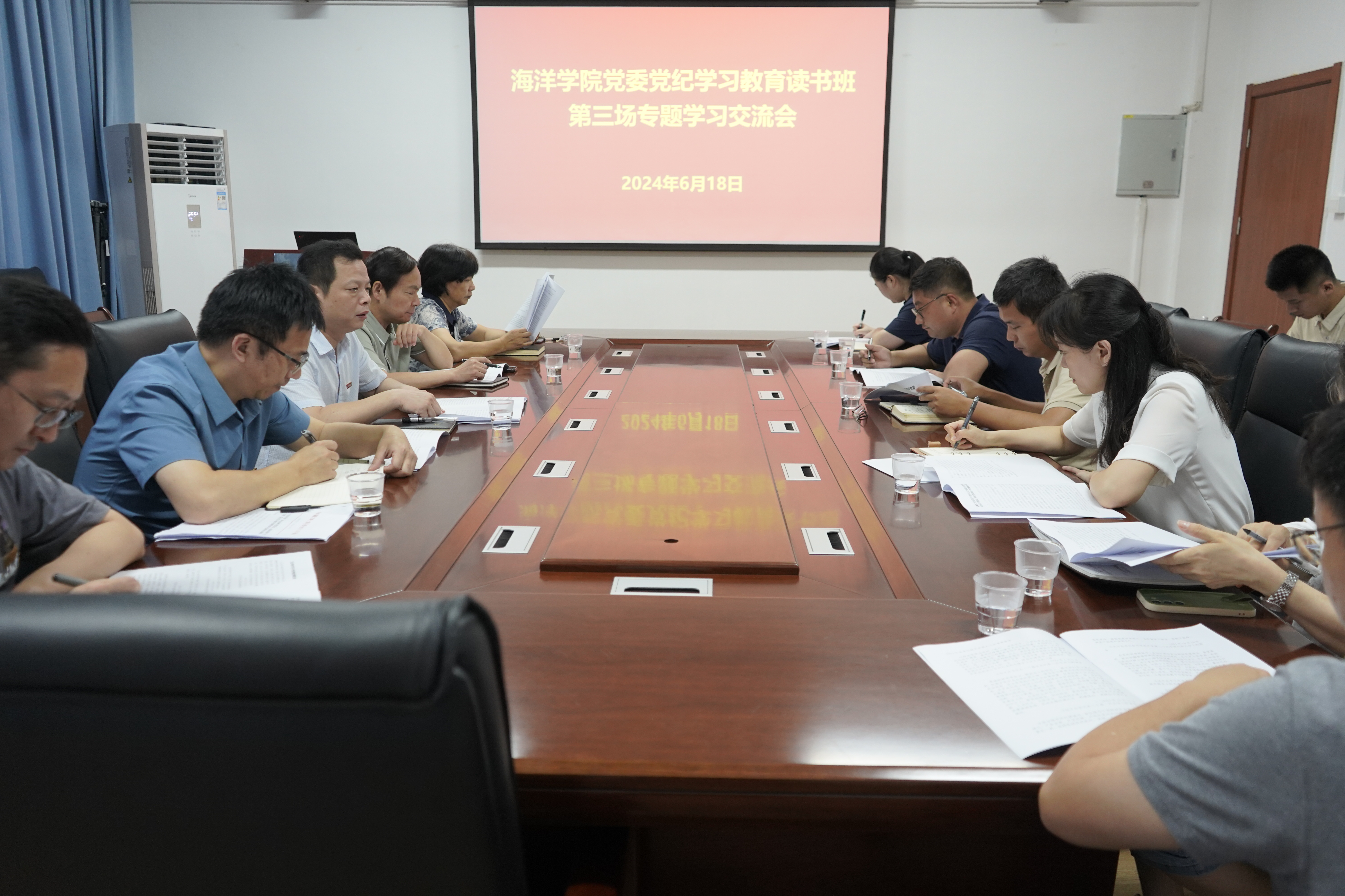6月18日上午,海洋学院党委党纪学习教育读书班开班第三场专题学习交流会在学院501会议室举行。学院领导班子成员、党支部书记、教学系(实验中心)负责人、科室负责人、辅导员等参加。会议由学院党委书记黄毅军主持。