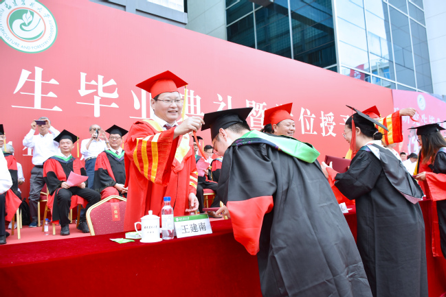为博士毕业生和硕士毕业生代表扶正流苏、颁发学位证书
