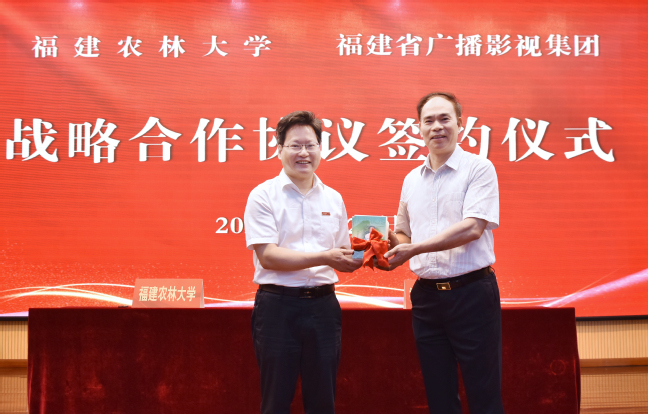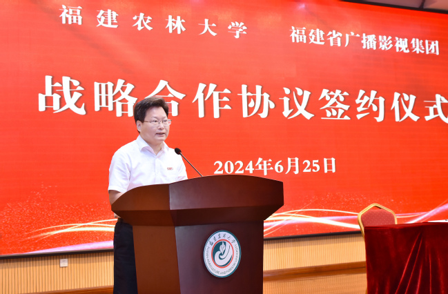 王建南代表学校致辞。他指出,福建省广播影视集团是我省的主要党媒,长期以来依托各类传媒平台,广泛宣传报道我校办学的新亮点、新进展以及服务国家和我省经济社会发展的新成效,双方在长期协作互动中结下深厚情谊。他代表学校对福建省广播影视集团表示衷心感谢,期盼双方以此次签约为契机,进一步携手合作,发挥各自优势,深化智库建没、推进人才联培,深化产教融合、协同育人,共同打造具有闽派特色的服务乡村振兴和农业农村现代化的精品力作,为促进我省“三农”发展、推进中国式现代化福建实践提供智力支持。