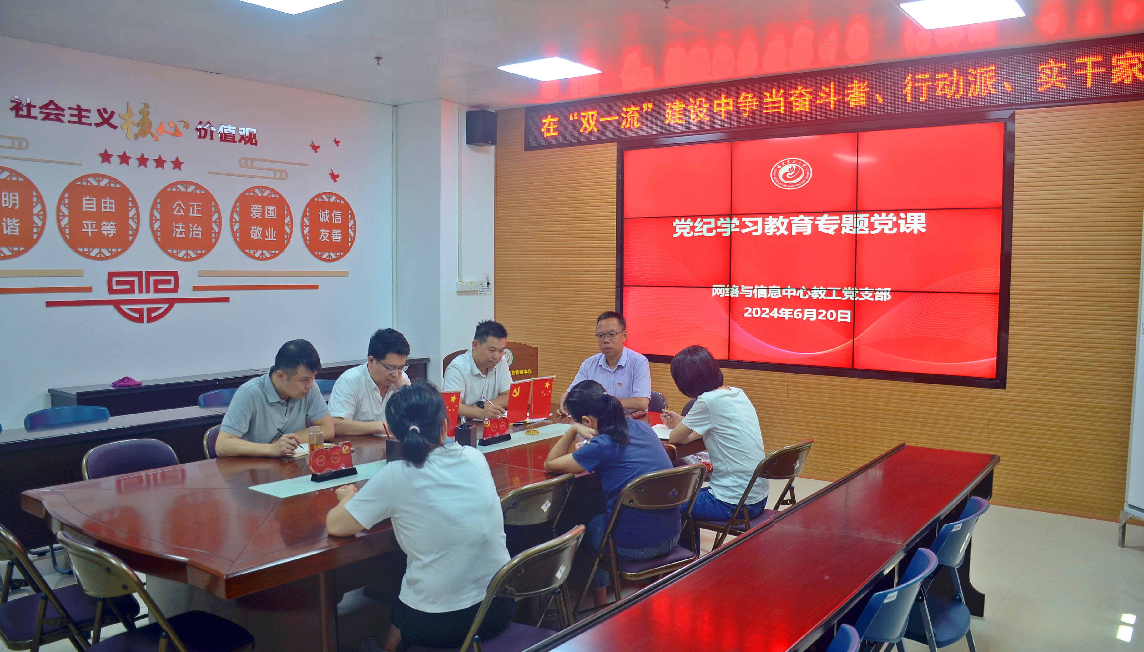 近日,网络与信息中心教工党支部在金综楼培训室召开党纪学习教育专题党课。支部书记曾海滨以“加强党的纪律建设 抓好党纪学习教育”为主题,结合工作实际,为全体党员讲授专题党课,并交流学习《中国共产党纪律处分条例》(以下简称“《条例》”)的心得体会与实践要求。