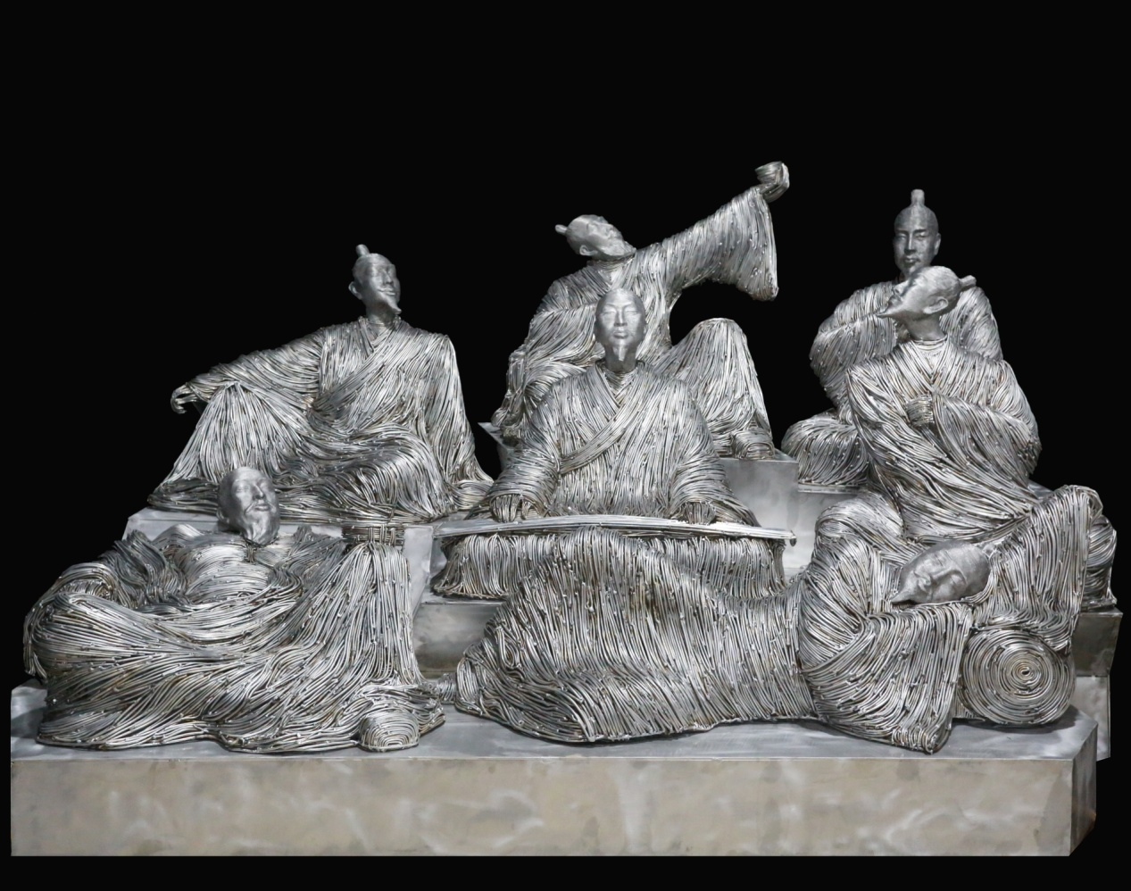 《畅叙幽情》是倪志强老师观察社会形态,专心致力于金属材料创作长达10年的创作研究成果。整件作品尺幅长2.2米.宽1.6米,高1.38米,重达130公斤左右。在人物塑造中,借助一根根金属铝线,由点连成面,再由面变成体,在弧光焊枪中,分割着空间又占有着空间,呈现出一种自然的秩序感和节奏感。整件作品重意略形,似疏而密,似紧而松。该作品通过塑造古代文人墨客悠然自得的神情,潇洒自如的形象,相映成趣的动态组合,宛若其欣于所遇,暂得于己,快然自得,或因寄所托,放浪形骸之外,乐山乐水乐人,这与当今现代人由于忙碌忽略了精神文化的内含需求、忽视了最原始的初心形成鲜明对比。作者希望借古喻今,让精神迷茫的现代人能找到一点心灵的慰藉。