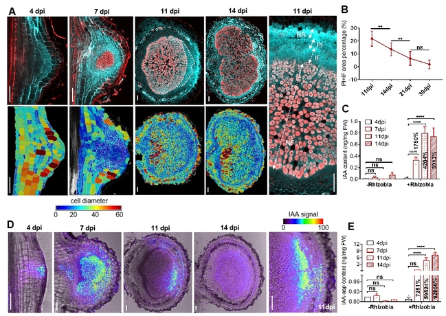 首先,该研究团队采用细胞染色、三维模拟根瘤细胞结构以及透射电镜观察等方法,对4至14天接种根瘤菌后的大豆根瘤进行了细致分析。根据细胞大小,将接种根瘤菌11天后的根瘤划分为四个区域:皮层区、前侵染区、侵染区和固氮区。通过使用IAA抗体检测和生长素代谢测定,研究团队发现生长素在根瘤的前侵染区和侵染区积累,并随着根瘤逐渐成熟,生长素信号与根瘤分区同步消失,这暗示了生长素水平与根瘤侵染区的存在可能存在正相关。