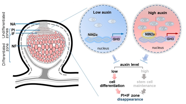 图2 NIN2a–GH3–auxin协调大豆分区消失的模型