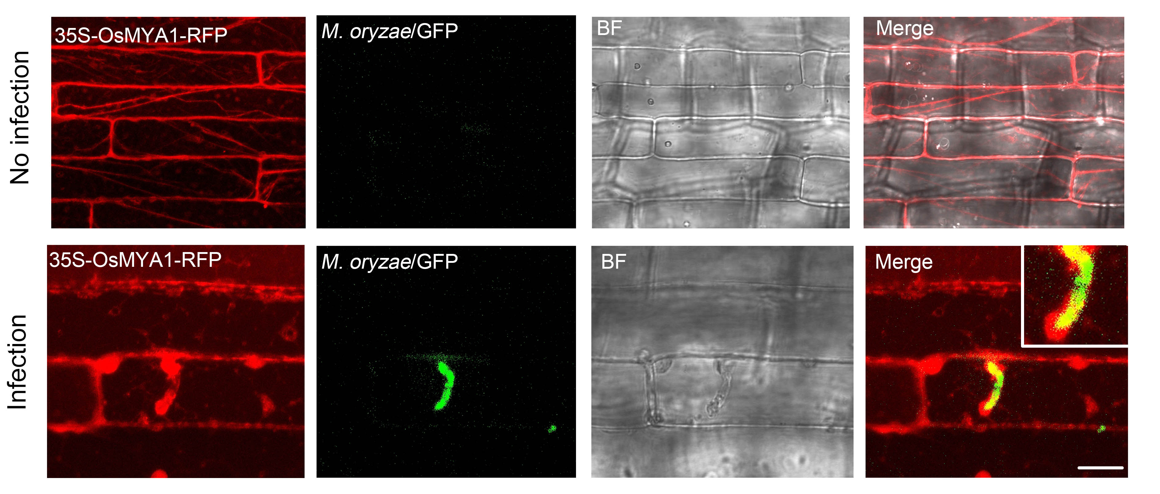 该研究在前期转录组的数据中鉴定了一个编码微丝马达蛋白基因OsMYA1能够响应稻瘟菌的侵染,并发现该基因水稻突变体降低了水稻防御稻瘟菌侵染的能力。作用机制研究发现,在稻瘟菌未侵染时,水稻马达蛋白OsMYA1定位于微丝骨架。但当稻瘟菌IH侵入时,OsMYA1蛋白的荧光信号发生移位,聚集到IH周边,包裹IH。