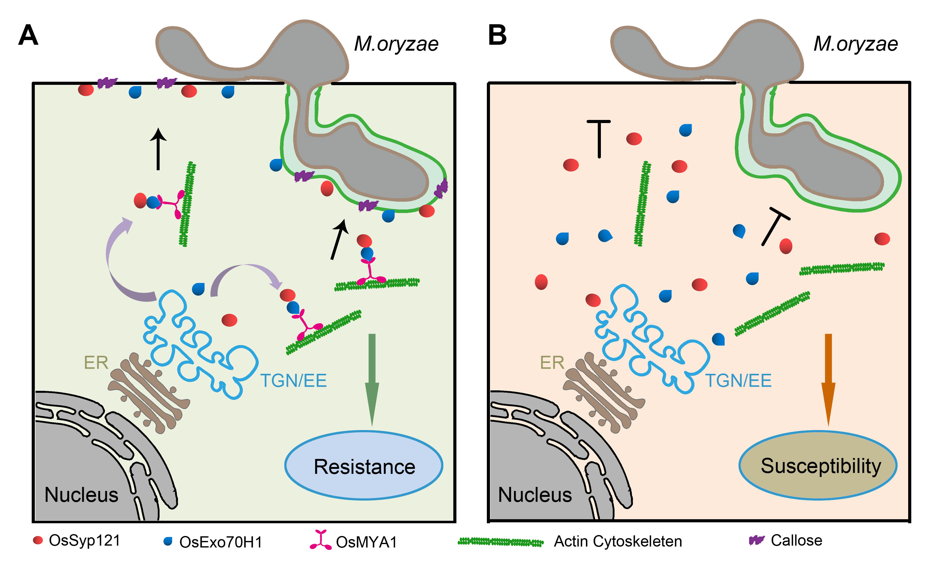 通过互作筛选,发现OsMYA1蛋白的货物结合结构域(Cargo binding domain, CBD)能够和胞吐复合体成员OsExo70H1相互作用,并且发现OsMYA1介导了OsExo70H1蛋白从细胞质转运到细胞膜及水稻-稻瘟菌互作界面。有意思的是,研究还发现OsExo70H1和外泌相关蛋白OsSyp121相互作用。稻瘟菌侵染后,OsSyp121由细胞内囊泡分布转变为细胞膜和EIHM分布。并且OsSyp121的定向转运依赖于OsMYA1和OsExo70H1。在OsMYA1和OsExo70H1突变体中OsSyp121向互作界面的转运受到了抑制,导致水稻的稻瘟病抗性下降。OsExo70H1作为桥梁蛋白连接了OsMYA1和OsSyp121,从而鉴定了由MoMYA1-OsExo70H1-OsSyp121组成的一条起始于微丝骨架到水稻-稻瘟菌互作界面的囊泡定向转运途径,为水稻的抗性防御机制提供了新见解。