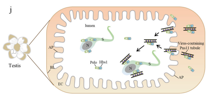 图1. Pelo-Hbs1复合物介导RGDV编码的Pns11小管进入睾丸并靶向精子表面的模型