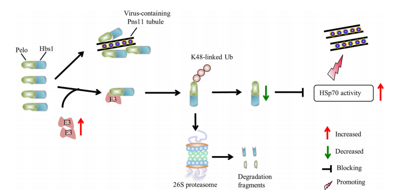 该论文以电光叶蝉和其垂直传播的RGDV为研究对象,首先明确了在电光叶蝉精子特异表达的Pelo-Hbs1复合体受RGDV侵染其蛋白积累水平有所下降,但mRNA水平不受影响。Pelo与RGDV 非结构蛋白Pns11直接互作从而介导包裹病毒粒体的Pns11小管靶向结合精子,促进Pns11小管介导的RGDV经父本垂直传播(图1)。随后发现Pns11小管的装配依赖于Hsp70的活性,而Pelo-Hbs1复合物中的Hbs1可通过抑制Hsp70活性抑制Pns11小管的组装,从而发挥病毒限制因子的功能。然而,病毒侵染激活的含有C3HC4-type RING domain的泛素连接酶E3介导Pelo泛素化降解,协同引起Hbs1降解。重要的是,Pns11有效地与Pelo竞争结合泛素连接酶E3,从而拮抗泛素连接酶E3介导的Pelo-Hbs1降解,这些过程导致病毒侵染的雄虫精巢中Pelo-Hbs1复合物的轻微减少,抑制了泛素连接酶E3对Pelo的过度降解,促进了有效的小管组装,从而维持了RGDV在精巢中的持久侵染(图2)。研究结果揭示了昆虫精子特异性表达的Pelo-Hbs1复合体被调节以促进植物病毒经介体父本垂直传播而不破坏精子功能的分子机制,为开拓新的阻断介体昆虫对植物病毒传播的策略提供了重要的理论基础。
