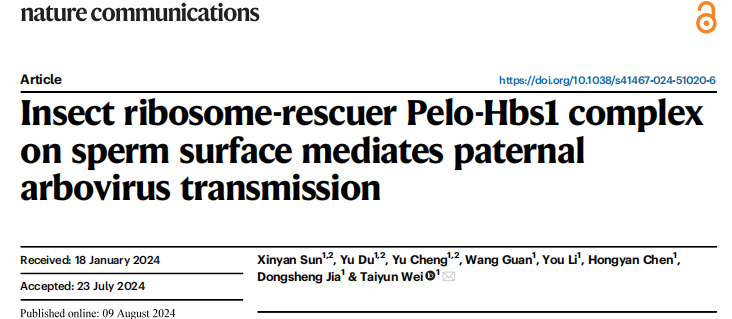 2024年8月9日,植物保护学院魏太云研究员团队在《Nature Communications》(《自然-通讯》)期刊在线发表了题为" Insect ribosome-rescuer Pelo-Hbs1 complex on sperm surface mediates paternal arbovirus transmission "(昆虫精子表面核糖体拯救复合物Pelo-Hbs1介导父系虫媒病毒传播的机制)的研究论文,发现在精子表面表达的昆虫核糖体拯救复合体Pelo-Hbs1介导雄虫垂直传播RGDV,揭示了昆虫精子特异性表达的Pelo-Hbs1复合体被调节以促进病毒经父本垂直传播而不破坏精子功能的分子机制。