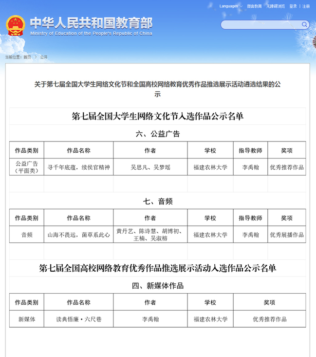全国大学生网络文化节和全国高校网络教育优秀作品推选展示活动由教育部思想政治工作司、中央网信办网络社会工作局主办,是全国高校网络思政领域级别最高、覆盖面最广的竞赛之一。第七届全国大学生网络文化节和全国高校网络教育优秀作品推选展示活动以“争做校园好网民,汇聚网络正能量,挺膺担当建新功”为主题,设置优秀推广作品奖、优秀展播作品奖、优秀推荐作品奖、优秀入围作品奖等奖项。自活动启动以来,学校党委宣传部、党委学生工作部、校团委等相关部门积极组织广大师生编创优秀网络文化作品,经作品申报、校级评选、择优推荐等环节,遴选出优秀作品参与省委教育工委评审、教育部遴选评审。我校黄丹艺、陈诗慧、胡博初、王楠、吴淑榕同学的广播作品《山海不畏远,菌草系此心》(指导老师:李禹翰)获音频类全国优秀展播作品奖,吴思凡、吴梦瑶同学的设计作品《寻千年底蕴,续侯官精神》(指导老师:李禹翰)获公益广告类全国优秀推荐作品奖,李禹翰老师的视频作品《读典悟廉·六尺巷》获新媒体类全国优秀推荐作品奖。