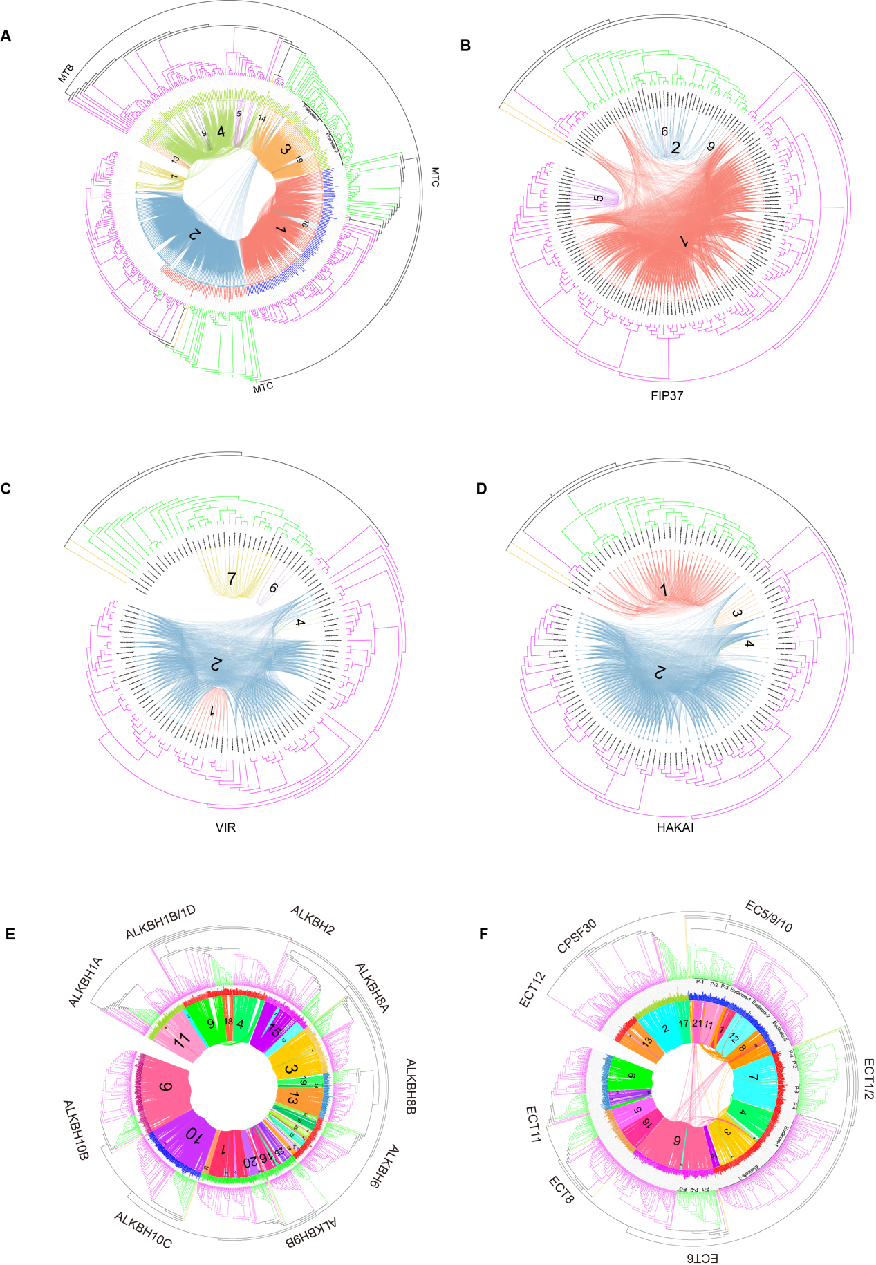 图三 被子植物中(A)MT-A70s,(B)FIP37s,(C)VIRs,(D)HAKAIs,(E)ALKBHs, (F)YTHs的系统进化和共线性关系