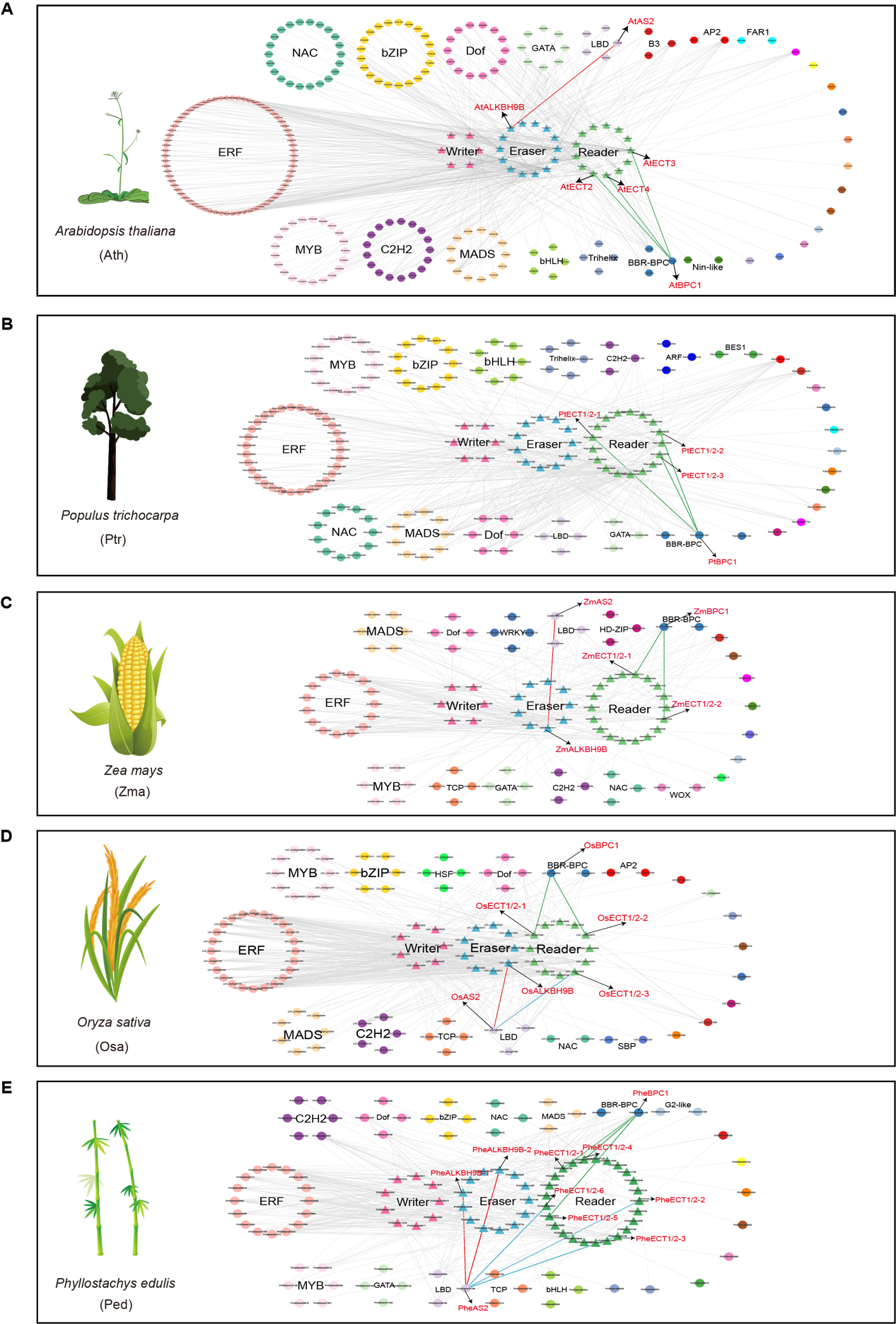 图六 拟南芥、杨树、玉米、水稻和毛竹中m6A调控元件的转录因子网络