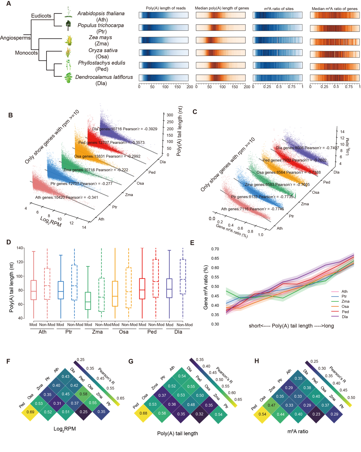 图四 六种被子植物的poly(A)尾巴长度和m6A修饰图谱。(A)不同物种中整体的读段poly(A)尾巴长度、基因poly(A)尾巴长度中位数、修饰位点的m6A修饰率和基因的m6A修饰率中位数分布;(B)散点图展示了基因表达和poly(A)尾巴长度的关联;(C)散点图展示了基因表达和m6A修饰的关联;(D)箱形图展示了有m6A修饰和没有m6A修饰的基因的poly(A)尾巴长度;(E)折线图展示了基于基因poly(A)尾巴长度排序的m6A修饰率分布;热图展示了不同物种直系同源基因之间的(F)基因表达水平,(G)poly(A)尾巴长度和(H)m6A修饰皮尔逊相关性。