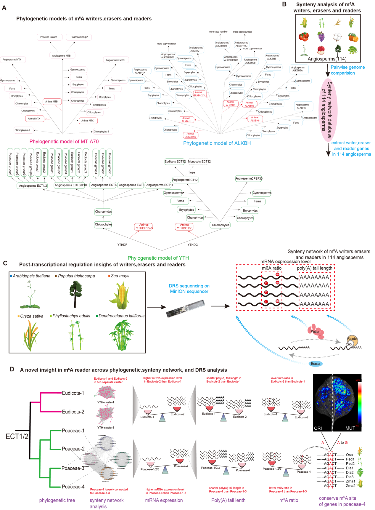图七 本研究的简要总结。(A)推断的MT-A70、ALKBH和YTH家族在植物中的进化模型;(B)共线性网络分析。共线性网络分析表明,ECT1/2-Eudicots1和 ECT1/2-Eudicots2被分别聚成了两个集群,ECT1/2-Poaceae4与ECT1/2-Poaceae1-3分支连接松散。系统进化分类和共线性网络模式的差异可能是导致ECT1/2-Eudicots2和ECT1/2-Poaceae4分支中基因表达升高的原因;(C)m6A甲基转移酶、去甲基酶和阅读蛋白的转录后调控见解。与其他分支相比,ECT1/2-Eudicots2和ECT1/2-Poaceae4分支的m6A修饰明显较低,基因的Poly(A)尾巴长度略微缩短,这可能是造成这些分支中基因表达的升高的另一个原因;(D)基于系统发育、共线性网络和DRS数据的综合分析的新见解。