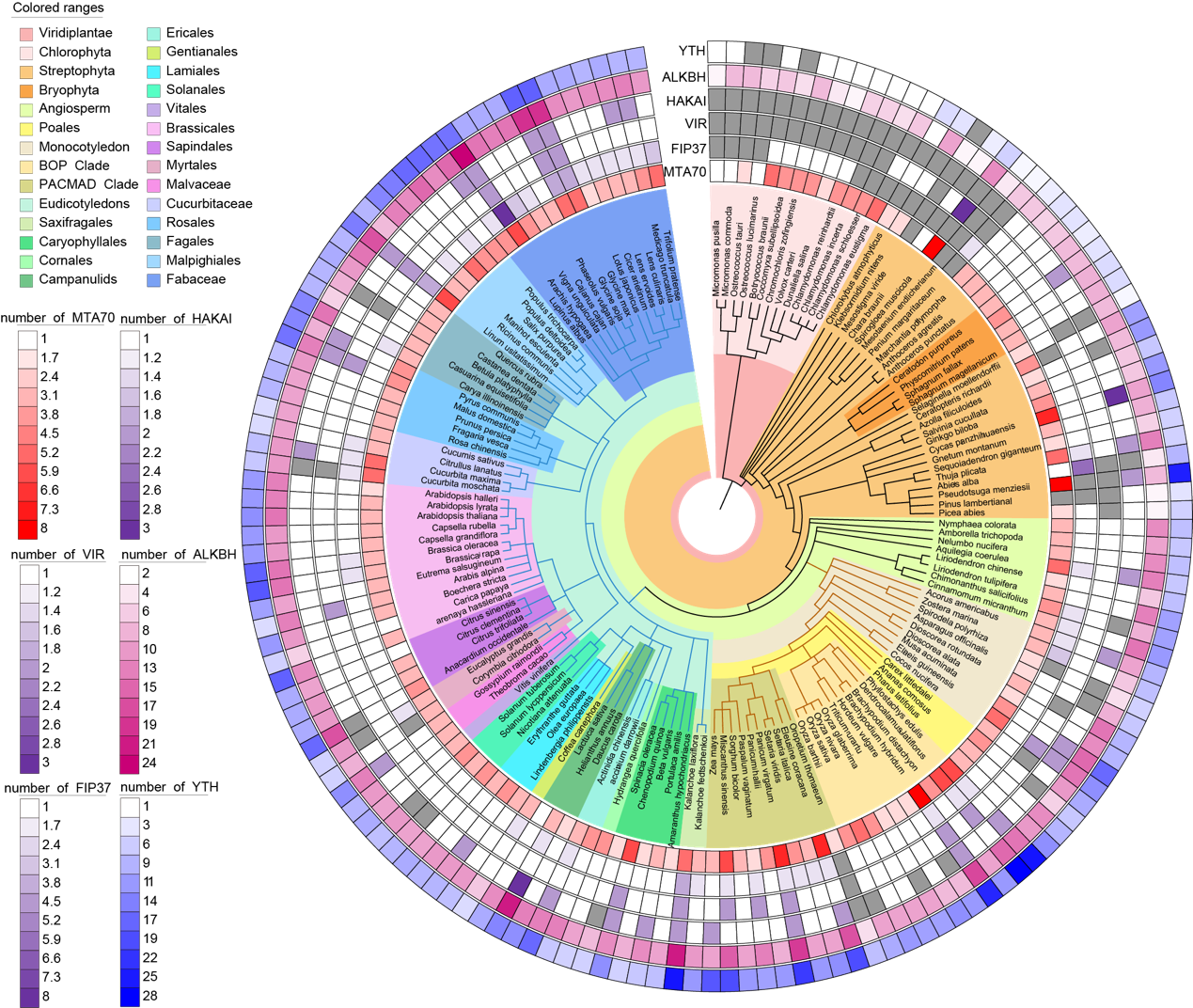 该研究首先从13种绿藻、7种轮藻、7种苔藓、1种石松、3种蕨类、9种裸子和114种被子植物中鉴定到了4062个m6A调控元件,包含512个MT-A70,200个FIP37,145个VIR,148个HAKAI,1615个ALKBH,1496个YTH蛋白 (图一)。其中m6A甲基转移酶的各个组分(包括MT-A70、FIP37、VIR和HAKAI)的数目都比较保守,ALKBH家族的数目从低等到高等植物中存在着轻微的扩张现象,而YTH家族存在着明显的扩张现象。