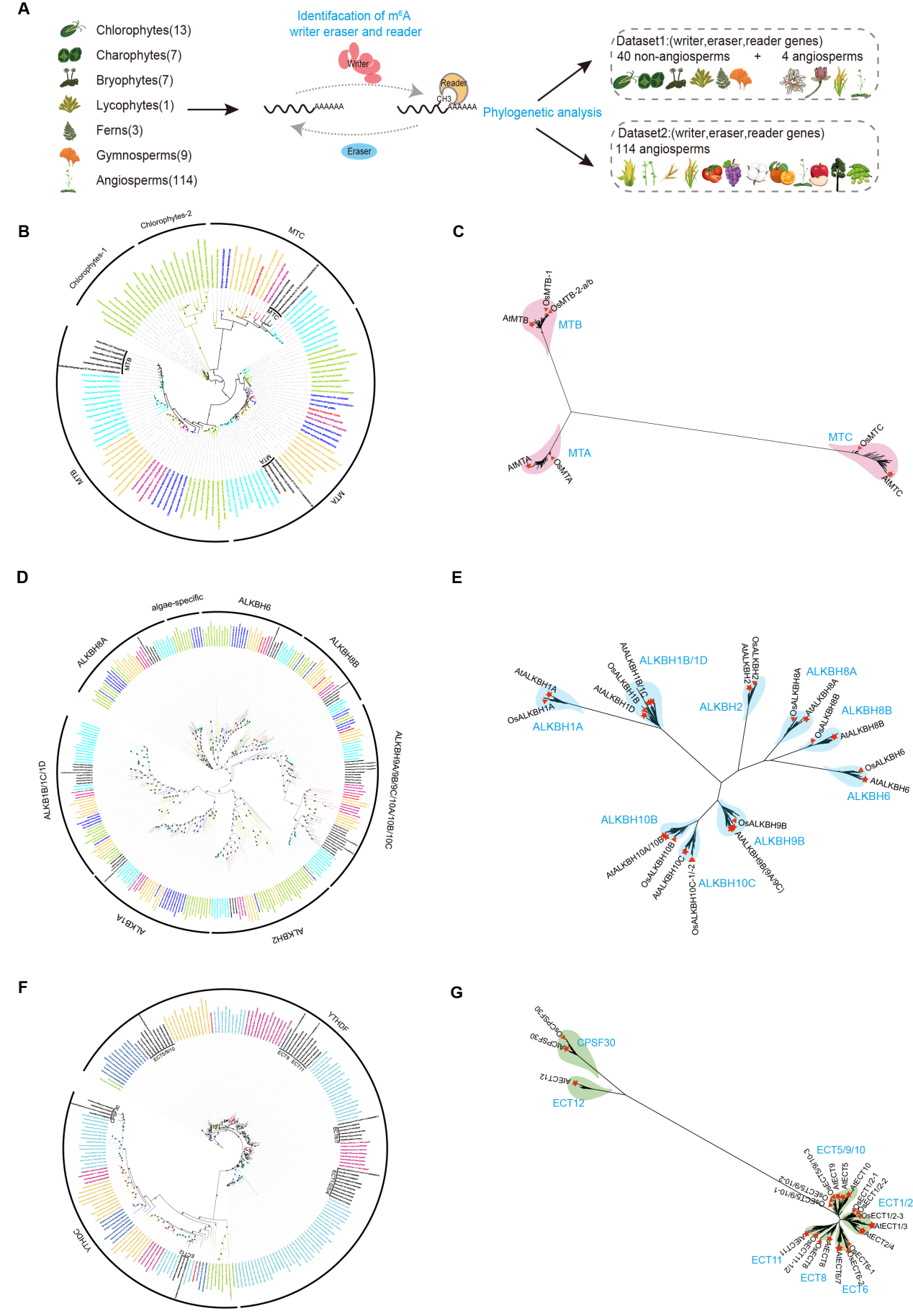 图二 m6A调控元件的系统发育分析。(A)系统发育分析流程示意图;(B)使用来自4种被子植物和40种非被子植物的133个MT-A70蛋白构建的绿色植物中MT-A70家族的系统发育树;(C)使用来自 114种被子植物的393个MT-A70蛋白构建的被子植物中MT-A70家族的系统发育树;(D) 使用来自4种被子植物和40种非被子植物的212个ALKBH蛋白构建的绿色植物中ALKBH家族的系统发育树;(E) 使用来自 114种被子植物的1294个ALKBH蛋白构建的被子植物中ALKBH家族的系统发育树;(F) 使用来自4种被子植物和40种非被子植物的227个YTH蛋白构建的绿色植物中YTH家族的系统发育树;(G) 使用来自 114种被子植物的1315个YTH蛋白构建的被子植物中YTH家族的系统发育树。