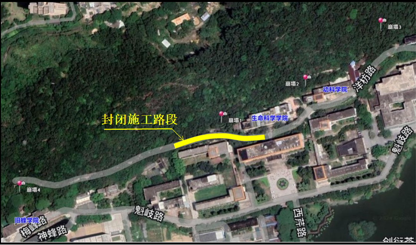 根据学校基建工程安排,生科楼前后山体崩塌工程治理项目正在紧张施工中。按施工进度计划,明日开始对生科楼西侧边坡崩塌位置进行施工,由于该路段宽度较窄,边坡施工需要较大的安全作业范围,为尽快推进边坡崩塌治理工作,届时将对洋枋路-生科楼路段进行封闭施工,现将有关事宜通知如下:
