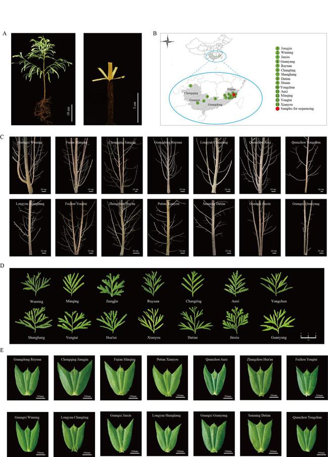 图一. 用于福建柏基因组测序的材料及14个种源的形态多样性