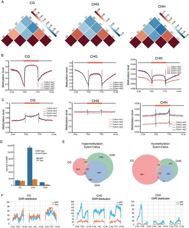 图4. 福建柏愈伤组织和木质部的DNA甲基化特征
