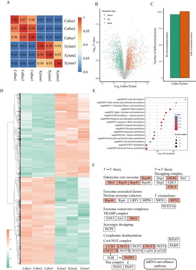 进一步使用定量蛋白质组学比较愈伤组织和木质部的蛋白水平。总共发现了1,970个差异蛋白(图5),KEGG通路分析揭示上调蛋白质富集在RNA降解通路(图5)。这包括5' -> 3'降解复合体的组成部分(DDX6和EDC4)、3' -> 5'降解核心外泌体(Rrp40/4345和Mtr3)、5'外核酸酶(XRN2)和CCR4-NOT复合体(CCR4、CNOT1/3/7/8和PABP1)。