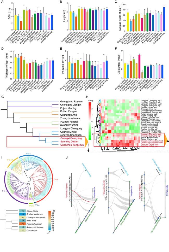 当前人们对福建柏的过度开采已对其遗传变异和分布造成了威胁。本研究收集了来自中国不同地区的14个福建柏种源。这些种源的叶片和茎表现出不同的形态特征,进一步显示了遗传多样性,并为未来的泛基因组和重测序提供了初步资源。基于14个种源单核苷酸多态性(SNPs)的系统发育分析揭示了七个不同的群体(图7)。萜类化合物是异戊二烯的聚合物及其衍生物的总称,常见于福建柏中并发挥重要作用。系统发育进化的结果显示,14个福建柏树种源可以分为不同的群体,如广西、三明和泉州组,与代谢组学结果一致地形成了一个簇(图7)。萜类合成酶(TPSs)是萜类化合物生物合成的关键酶。进化树分析揭示福建柏中的TPS基因家族可以分为七个主要类(TPS-a到TPS-f),其中六个类在被子植物中也存在。TPS-d代表了一个独特的支系存在于裸子植物中,和其他裸子植物比较发现福建柏具有更多的TPS基因。