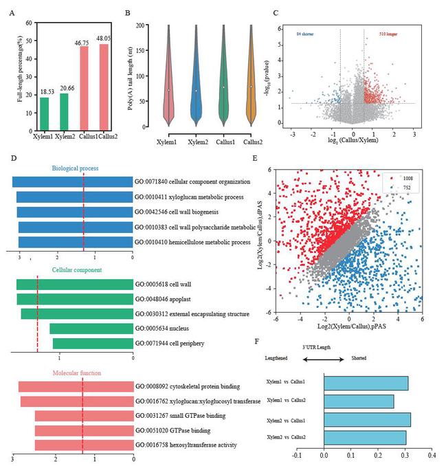 定量蛋白质组学揭示了差异蛋白涉及RNA降解和mRNA 3'-UTR结合相关的蛋白。因此,本研究对愈伤组织和木质部进行了Nanopore直接RNA测序(DRS),以揭示两种组织间全局多聚poly(A)长度(PAL)和选择性多腺苷酸化(APA)的变化。DRS结果显示愈伤组织中的PAL长度普遍长于木质部(图6)。在愈伤组织中,具有较长PAL的基因在细胞壁生物合成、细胞骨架蛋白结合、己糖转移酶活性等方面表现出富集。特别地,观察到愈伤组织中的3'UTR由于APA而较短。