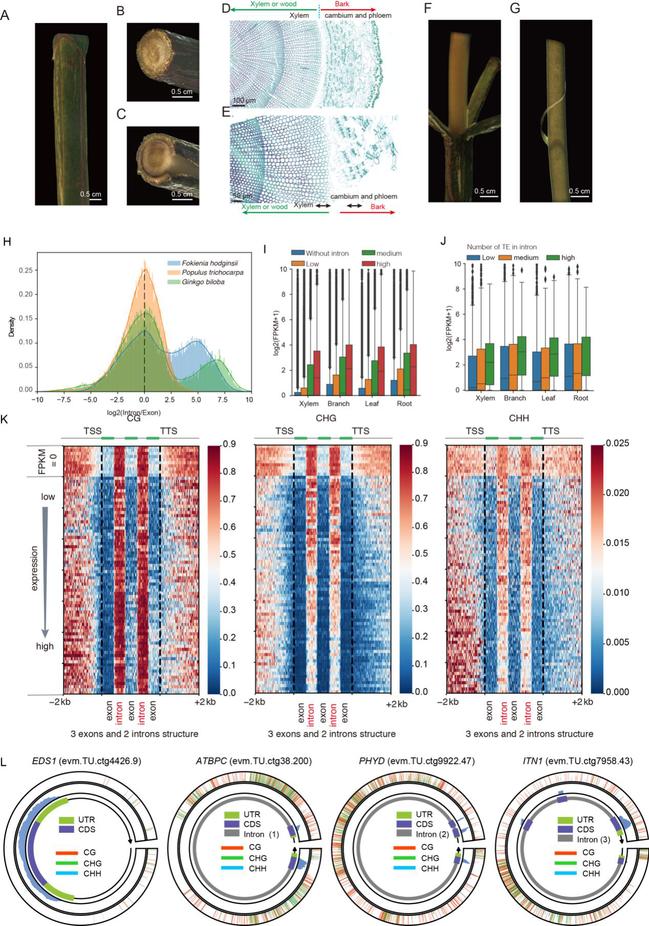 本研究使用了基于转录组的比对、预测以及同源搜索等方法共注释了50,521个蛋白编码基因。外显子的平均长度为269个碱基,内含子的平均长度为7,424个碱基。与被子植物进行比较观察到其较长的内含子(见图3)。同时内含子/外显子的长度与表达水平呈正相关。长内含子具有较高的TE插入频率。同时内含子中含TE的基因表现出较高的表达水平。这一结果表明,包含TE的内含子与mRNA表达有一定的相关性,这与之前在油松中的研究结果一致 (Niu et al., 2022)。对木质部进行的全基因组亚硫酸盐测序(BS-Seq)揭示了内含子区域的高DNA甲基化水平(图3)。包含内含子的基因具有较高的甲基化水平。相反单外显子基因显示出低甲基化水平。